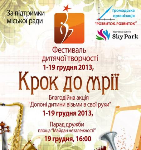 Напередодні дня Святого Миколая громадська організація «Розвиток. Розвиток» за сприяння Вінницької міської ради проводить фестиваль дитячої творчості та таланту «Крок до мрії». Вже традиційно фестиваль стартує з благодійної акції для дітей нашого міста. Як і у попередні роки, ГО «Розвиток. Розвиток» дарує можливість вінничанам відчути себе у ролі Святого Миколая та закликає їх приєднатися до благородної справи: «Долоні дитини візьми в свої руки!»