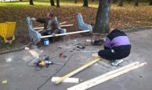 В парку імені Горького ремонтують лавки. Двоє робітників міняють старі дошки на нові соснові.