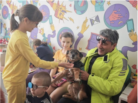 Разом із ним до лікарні завітав його добрий і надзвичайно лагідний чотирилапий друг Ерік Бафо, який одразу став улюбленцем маленьких пацієнтів.